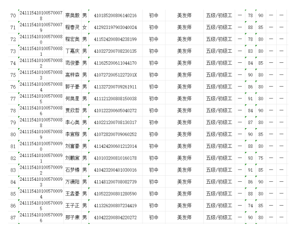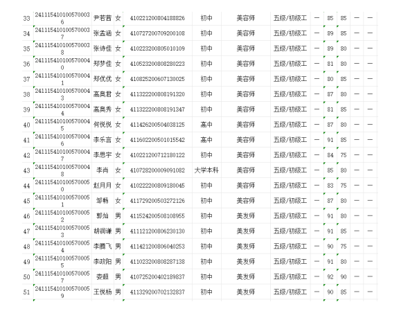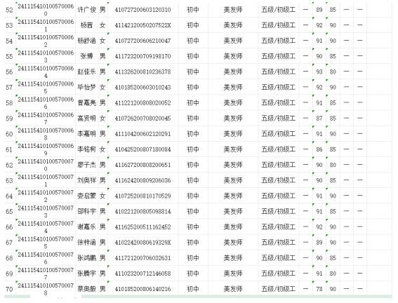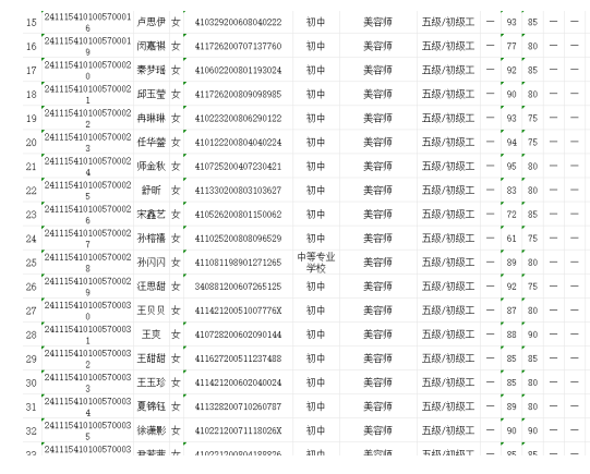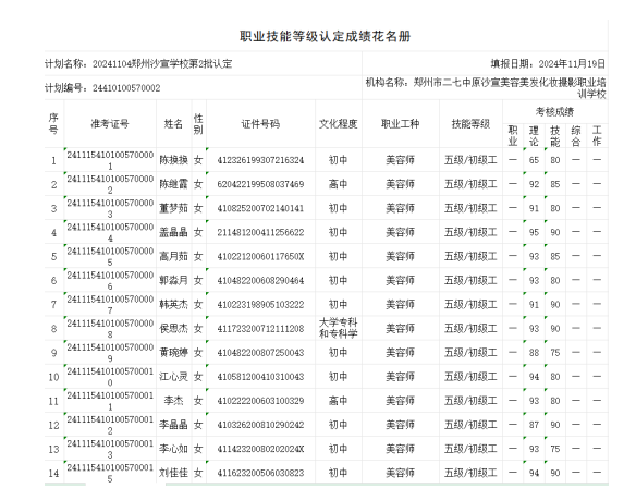 按照省市职业技能鉴定指导中心社会培训评价组织职业技能等级认定工作要求,结合本机构实际工作,郑州市二七中原沙宣美容美发化妆摄影职业培训学校于2023年12月23日进行了美容师(五级/初级工)职业技能等级认定评价考核,共24人合格(明细详见下图),根据职业技能等级认定工作流程要求,特将认定结果予以公示。