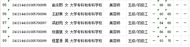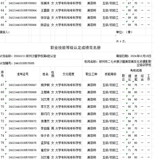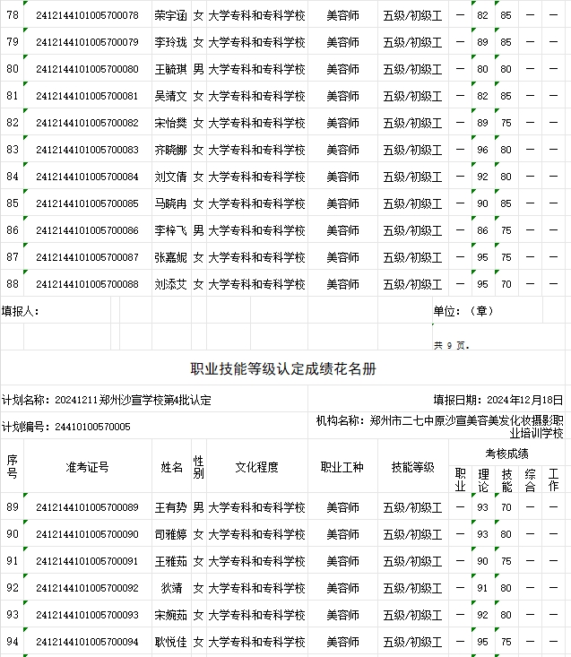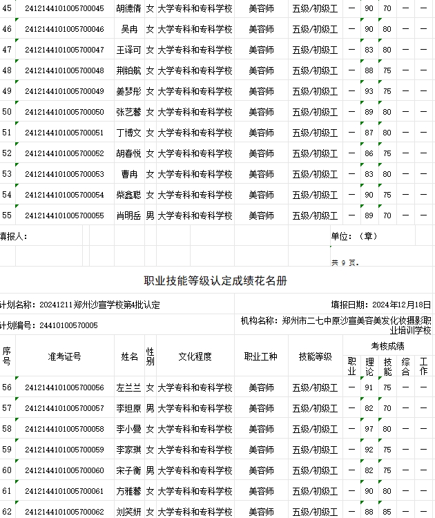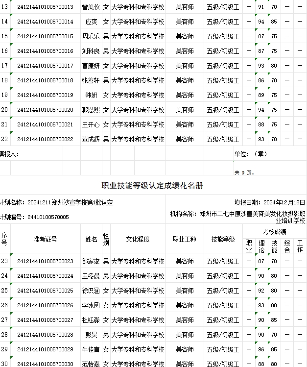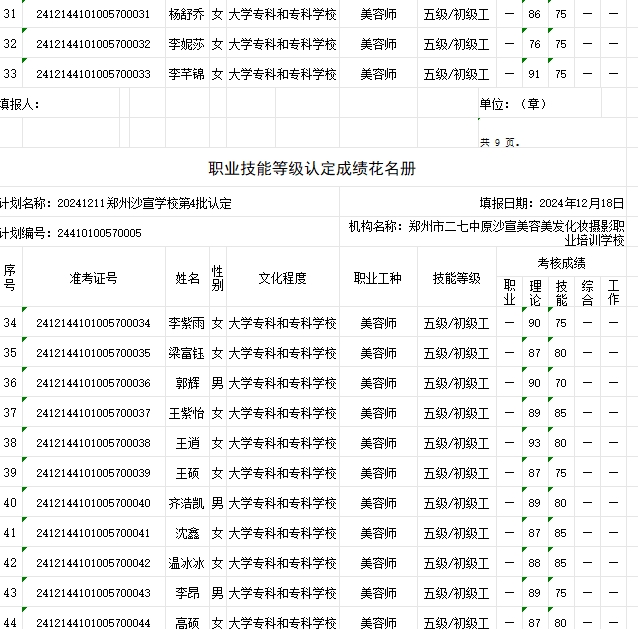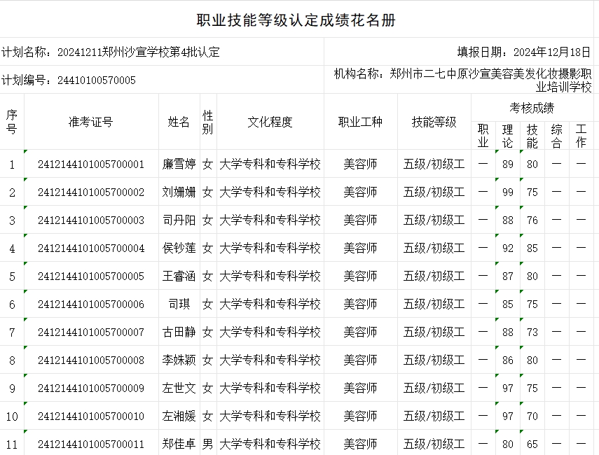 按照省市职业技能鉴定指导中心社会培训评价组织职业技能等级认定工作要求,结合本机构实际工作,郑州市二七中原沙宣美容美发化妆摄影职业培训学校于2024年11月28日和2024年12月14日进行了美容师(五级/初级工)职业技能等级认定评价考核,共99人合格(明细详见下图),根据职业技能等级认定工作流程要求,特将认定结果予以公示。