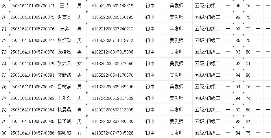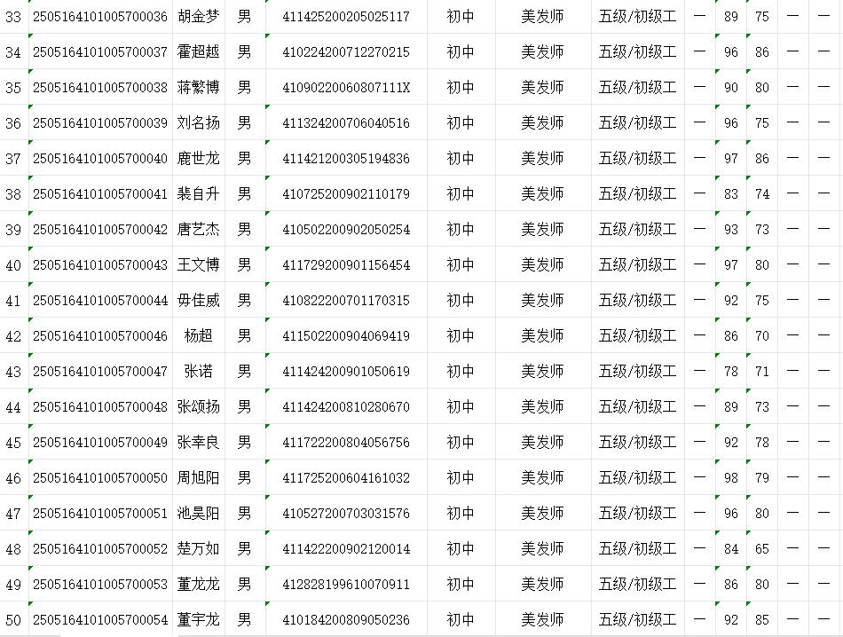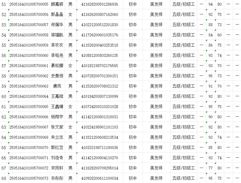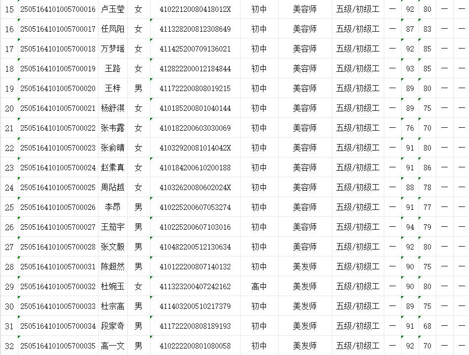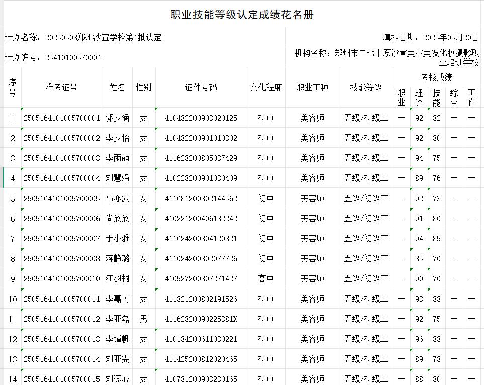按照省市职业技能鉴定指导中心社会培训评价组织职业技能等级认定工作要求,结合本机构实际工作,郑州市二七中原沙宣美容美发化妆摄影职业培训学校于2025年5月16日进行了美容师(五级/初级工)、美发师(五级/初级工)职业技能等级认定评价考核,共80人合格(明细详见下图),根据职业技能等级认定工作流程要求,特将认定结果予以公示。